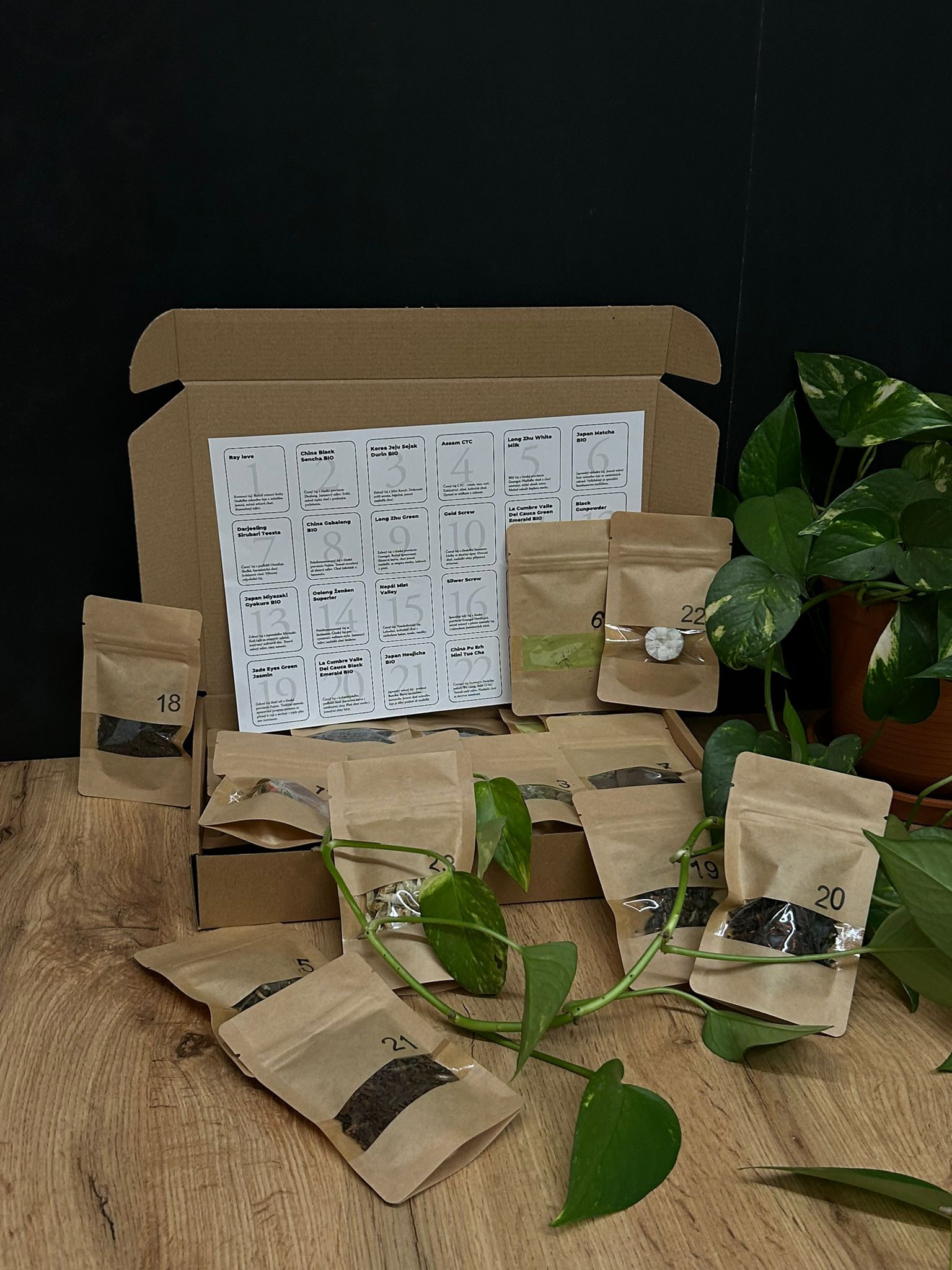 Kalendář obsahuje výběrové čaje bez příchuti. Najdete tu například BIO Japan Houjicha, Silver screw, Kvetucí čaj, BIO China Gabalong či 15. letý Pu-Erh mini Tuo Cha.