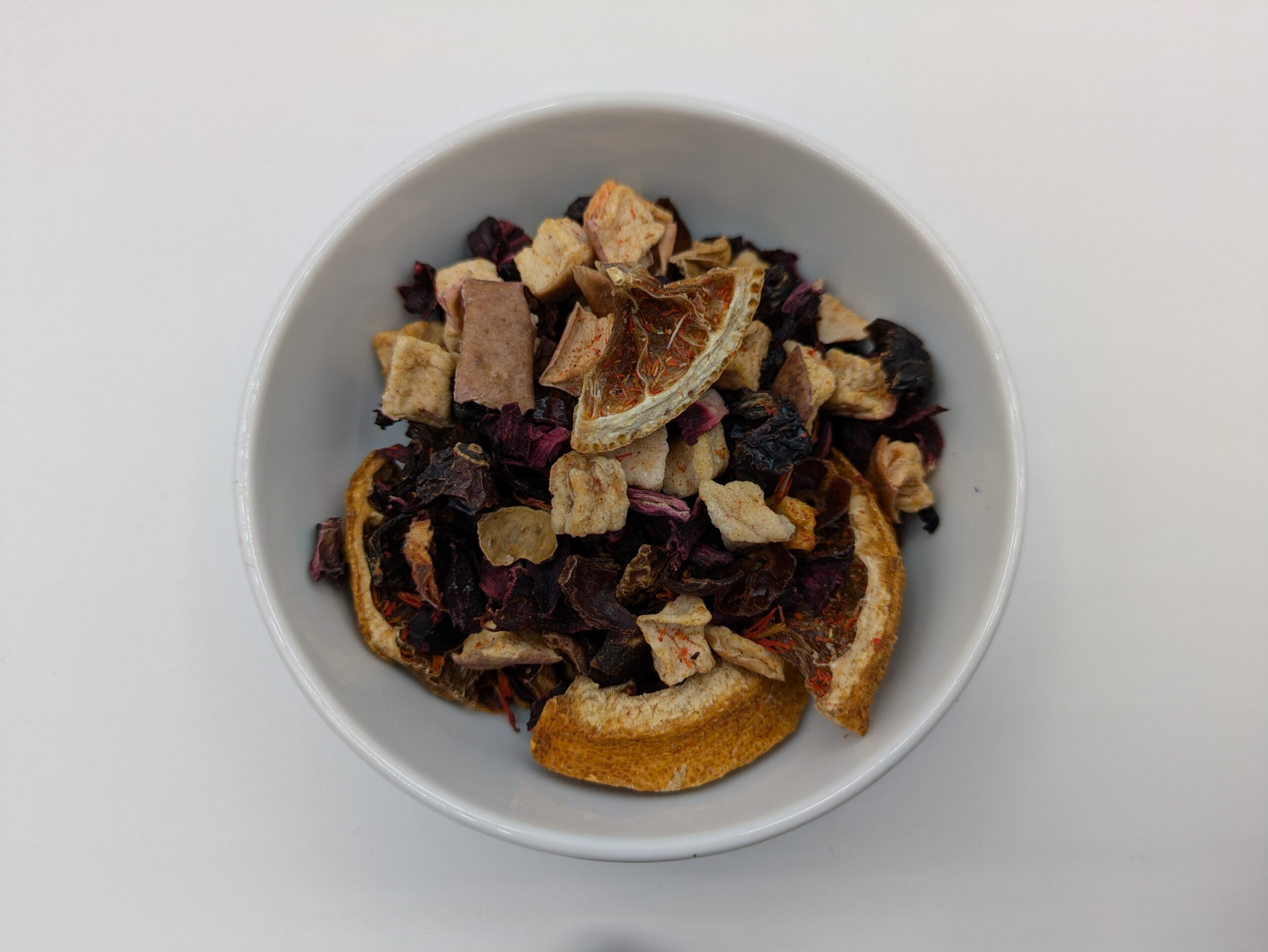 Složení: Plod jablka, květ ibišku, plod šípku, pomerančová kůra, květ světlice, plátky pomeranče, aroma.