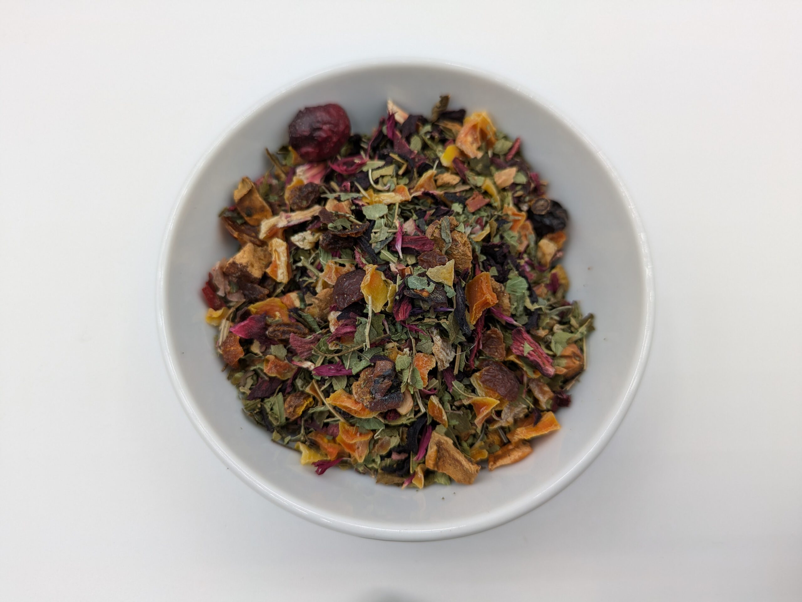Složení: Jablko, mrkev, ibišek, citronová tráva, šípek, rakytník, ostružina list, rybíz list, brusinka plod, slunečnice květ, klikva, aroma.